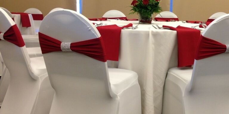 We have chair covers mostly in spandex for banquet chairs and folding chairs. Our chairs covers come in white, ivory and black. Call for other colors. Prices start at $1.00.